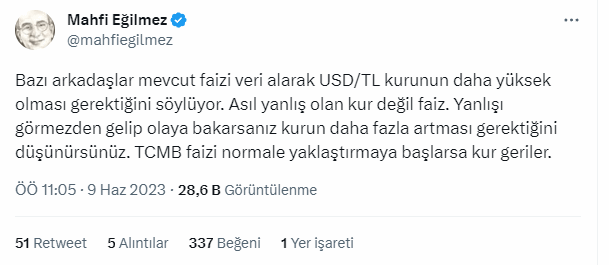 Ünlü İktisatçı Mahfi Eğilmez bir son dakika açıklamasında bulundu. Twitter adresi üzerinden yaptığı açıklamada Eğilmez, faize göre doların daha yüksek olması gerektiğini söyleyenlere cevap verdi. Yanlışın dolarda değil faizde olduğunu söyleyerek açıklamasını sürdüren Eğilmez, faizlerin artması, normalleşme olması ile birlikte kurda gerileme olacağını söyledi. Eğilmez açıklamasında, "Bazı arkadaşlar mevcut faizi veri alarak USD/TL kurunun daha yüksek olması gerektiğini söylüyor. Asıl yanlış olan kur değil faiz. Yanlışı görmezden gelip olaya bakarsanız kurun daha fazla artması gerektiğini düşünürsünüz. TCMB faizi normale yaklaştırmaya başlarsa kur geriler" ifadelerini kullandı.