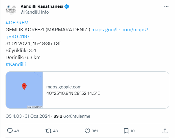 Marmara Denizi'nde bulunan Gemlik Körfezi'nde bugün saat 15.48 sularında 3.4 büyüklüğünde deprem yaşandı. Kandilli Rasathanesi'nin verilerine göre depremin derinliği 6.3 kilometre.