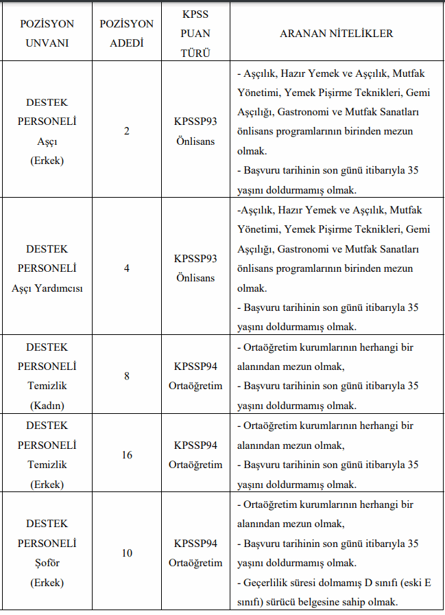 Milli Eğitim Bakanlığı tarafından az önce bir duyuru yayımlandı. Yayımlanan duyuruda en az lise mezunu adaylar arasından sözleşmeli kamu personeli alımı yapılacağına yer verildi. "Bakanlığımız Merkez Teşkilatı birimlerinde 657 sayılı Devlet Memurları Kanununun 4 üncü maddesinin (B) fıkrasına göre, 06/06/1978 tarih ve 7/15754 sayılı Bakanlar Kurulu Kararı ile yürürlüğe konulan Sözleşmeli Personel Çalıştırılmasına İlişkin Esasların Ek 2 nci maddesinin (b) fıkrası uyarınca istihdam edilmek üzere KPSS (B) grubu puan sıralaması esas alınmak suretiyle aşağıdaki tabloda nitelikleri belirtilen toplam 40 (kırk) adet boş pozisyon için sözleşmeli personel alınacaktır." ifadeleri ile az önce yayımlanan duyurunun detayları finans7.com'da.