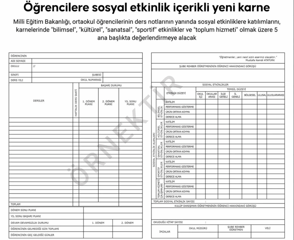 MEB resmi sayfasından yapılan son dakika açıklamasında daha önce ders ve davranış notlarını içeren öğrenci karnelerinde yapılan değişiklik sonrası 2023 2024 eğitim öğretim dönemi sonunda ilk defa karnelerin dağıtılacağına yer verildi. Artık karnelerde sadece akademik başarı değil, sosyal etkinlikler de yer alacak.