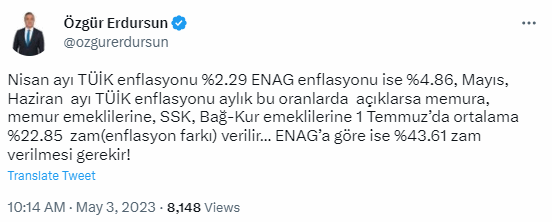 Sosyal Güvenlik Uzmanı Özgür Erdursun yaptığı son dakika açıklamasında, bugün açıklanan enflasyon rakamları ile birlikte oluşan 4 aylık enflasyon farkını açıkladı. Twitter adresi üzerinden açıklamalarda bulunan Erdursun şu ifadeleri kullandı: "Nisan ayı TÜİK enflasyonu %2.29 ENAG enflasyonu ise %4.86, Mayıs, Haziran ayı TÜİK enflasyonu aylık bu oranlarda açıklarsa memura, memur emeklilerine, SSK, Bağ-Kur emeklilerine 1 Temmuz'da ortalama %22.85 zam(enflasyon farkı) verilir… ENAG'a göre ise %43.61 zam verilmesi gerekir!"