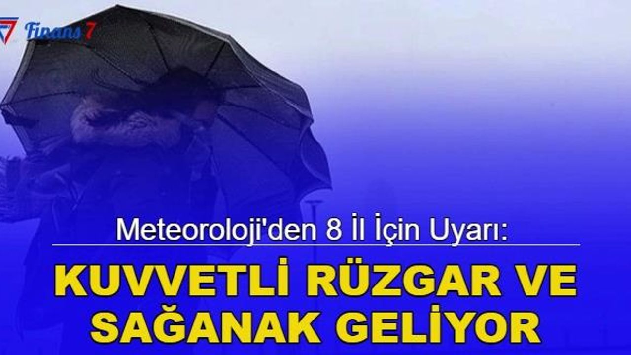 Meteoroloji Genel Müdürlüğü tarafından yapılan son dakika açıklamasında 8 ilde beklenen kuvvetli rüzgar ve sağanak nedeniyle ulaşımda aksamalar, çatı uçması, soba ve doğalgaz kaynaklı zehirlenmeler gibi olumsuzluklara karşı tedbirli olunması çağrısı yapıldı.