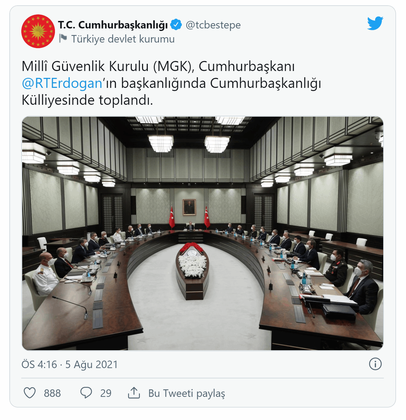 Milli Güvenlik Kurulu (MGK), Cumhurbaşkanı Recep Tayyip Erdoğan başkanlığında Beştepe'de Cumhurbaşkanlığı Külliyesi'nde toplandı.