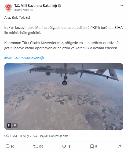 MSB, Irak'ın kuzeyindeki Metina bölgesinde tespit edilen 2 PKK'lı teröristin SİHA ile etkisiz hale getirildiğini açıkladı. Bölgedeki operasyonların devam edeceği vurgulandı.