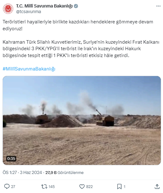 "Teröristleri hayalleriyle birlikte kazdıkları hendeklere gömmeye devam ediyoruz. Kahraman Türk Silahlı Kuvvetlerimiz, Suriye'nin kuzeyindeki Fırat Kalkanı bölgesindeki 3 PKK/YPG'li terörist ile Irak'ın kuzeyindeki Hakurk bölgesinde tespit ettiği 1 PKK'lı teröristi etkisiz hale getirdi"