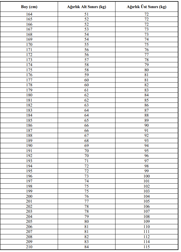 Evrak kontrolünden sonra adaylar boy kilo ölçümüne alınacak. Adayların aşağıdaki tabloda yer alan şartları taşıması gerekmektedir:
