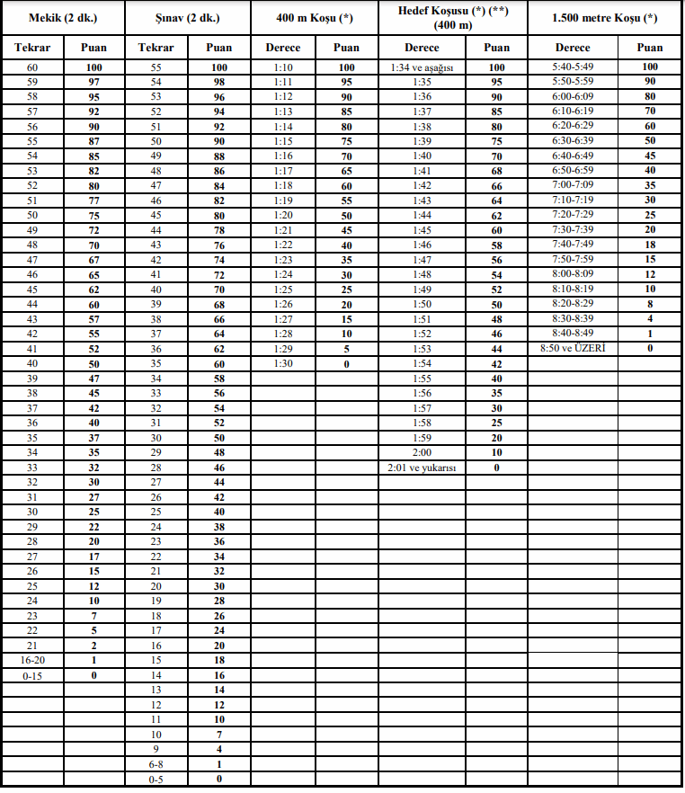 Adaylar, mekik ve şınav testlerinden en az 1 puan, sınav merkezinin fiziki ve iklim şartlarına göre belirlenecek olan 1500 m koşudan en az 1 puan, 400 metre düz koşudan en az 5 puan veya 400 metre hedef koşusundan en az 10 puan aldıkları takdirde bir sonraki aşamaya katılmaya hak kazanırlar. Bir veya daha fazla branştan puan alamadıkları takdirde başarısız sayılırlar."
