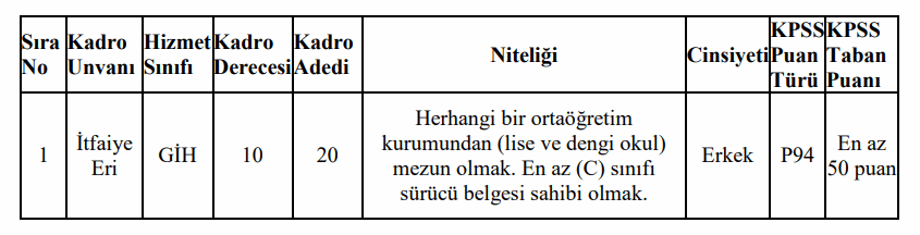 İlan edilen itfaiye eri kadroları için, mezun olunan okul itibarıyla öğrenim şartını taşımak ve bu öğrenimle ilgili olarak 2022 yılı Kamu Personel Seçme Sınavından (KPSS) alım yapılacak kadroların karşısındaki puan türlerinden, belirtilen asgari KPSS puanını almış olmak,