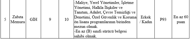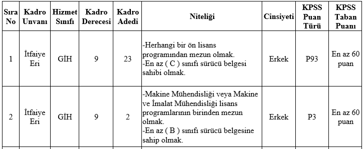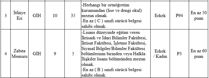• İlan edilen itfaiye eri ve zabıta memuru kadroları için, mezun olunan okul itibarıyla öğrenim şartını taşımak ve bu öğrenimle ilgili olarak 2022 yılı Kamu Personel Seçme Sınavından (KPSS) alım yapılacak kadroların karşısındaki puan türlerinden, belirtilen asgari KPSS puanını almış olmak,
