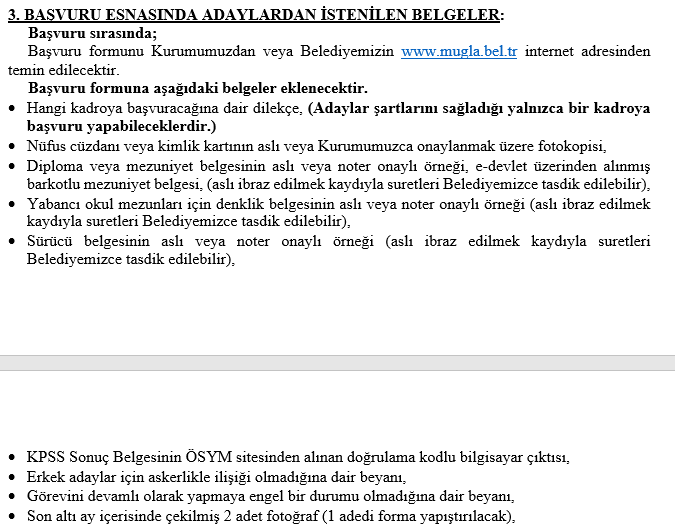 İlana başvurular 4-7 Aralık 2023 tarihleri arasında belediyeye şahsen yapılacak. Başvuru evrakları şu şekilde: