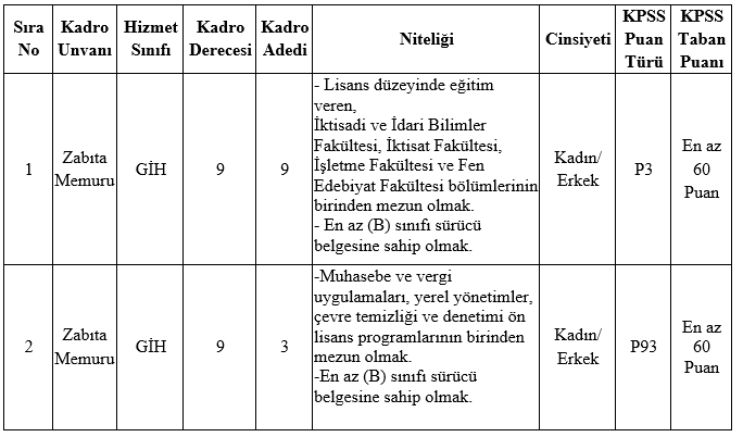 a) İlan edilen zabıta memuru kadrosu için, mezun olunan okul itibari ile öğrenim şartlarını taşımak ve bu öğrenimle ilgili olarak, 2022 yılı Kamu Personeli Seçme Sınavından (KPSS) alım yapılacak kadronun karşısındaki puan türlerinden, belirtilen asgari KPSS puanını almış olmak,