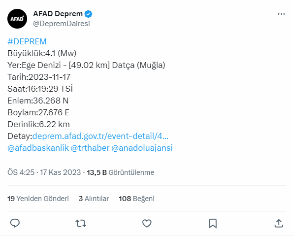 AFAD verilerine göre Muğla'nın Datça ilçesinde 4,1 büyüklüğünde bir deprem meydana geldi. Deprem birçok ilden hissedildi.
