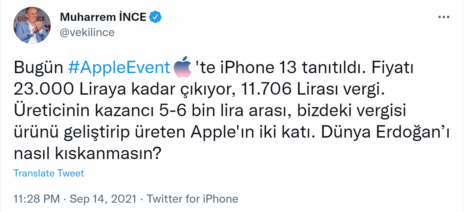Twitter hesabından paylaşımda bulunan İnce, "Bugün Appleevent'ta iPhone 13 tanıtıldı. Fiyatı 23.000 Liraya kadar çıkıyor, 11.706 Lirası vergi. Üreticinin kazancı 5-6 bin lira arası, bizdeki vergisi ürünü geliştirip üreten Apple'ın iki katı. Dünya Erdoğan’ı nasıl kıskanmasın?" ifadelerini kullandı.