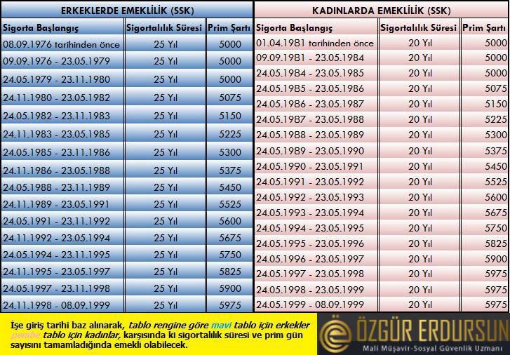 "08.09.1999 tarihine kadar sigortalı olan SSK'lılar bu tabloya göre ya da 3600 günle kadınlar 58, erkekler 60 yaşında emekli olacak. 09.09.1999 ile 30.04.2008'e kadar sigortalı olanlar kadınlar 58, erkekler 60 yaşında 7000 günle ya da 4500 gün 25 yıl ve kadınlar 58, erkekler 60 yaşında emekli olacak. 1.5.2008 sonrası sigortalı olanlar ise 7200 primi günüyle, kadınsa 58, erkekse 60 yaşında emekli olabilmek için söz konusu prim koşulunun 31 Aralık 2035 tarihine kadar yerine getirilmesi gerekecek. Bu tarihe kadar prim doldurulamazsa gecikilen her 2 yılda bir emeklilik yaşı 1 yıl uzayacak. 65 yaşına kadar kademeli olarak prim gün sayısını tamamladıkları tarihe göre emekli olacaklar, ya da 1 Mayıs 2008 tarihinden itibaren sigortalı yapılandan yaş haddinden emekli olmak için aranan 4500 gün prim sayısı, her yıl 100 gün artarak 1 Ocak 2016'dan itibaren 5400 güne çıkıyor. Yaş şartı da kadınlarda 61, erkeklerde 63 oluyor. 5400 gün prim ödemesini 1 Ocak 2036'dan 1 Ocak 2042'ye kadar tamamlayanların yaşı da kademeli olarak 65'e çıkıyor. Yani 5400 prim günü koşulu 31 Aralık 2035 tarihine kadar tamamlanamazsa emeklilik yaşı her 2 yılda yine 1 yıl uzuyor"