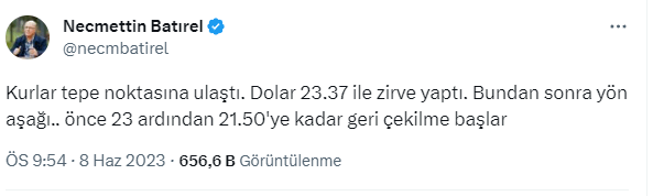 Enflasyonun açıklandığı ve dolar kurunda yükselişin başladığı gün bir paylaşım yapan Batırel, dolar için tepe nokta vermiş ve, "8 Haziran 2022'de dolar kuru 16.90 TL idi. Bugün 23.36 %38.22'lik artış var. Yıllık enflasyon ise 39.59 olarak açıklandı. Bu hesaba göre doların 23.59 TL'de zirve yapması gerekiyor" ifadelerini kullandı.