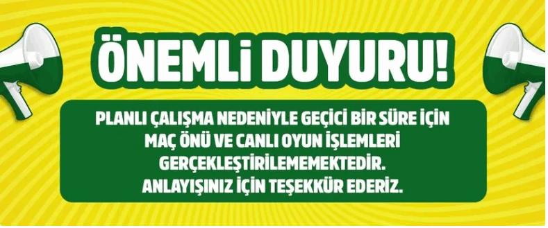 "Planlı çalışma nedeniyle geçici bir süre için maç önü ve canlı oyun işlemleri gerçekleştirilememektedir. Anlayışınız için teşekkür ederiz"
