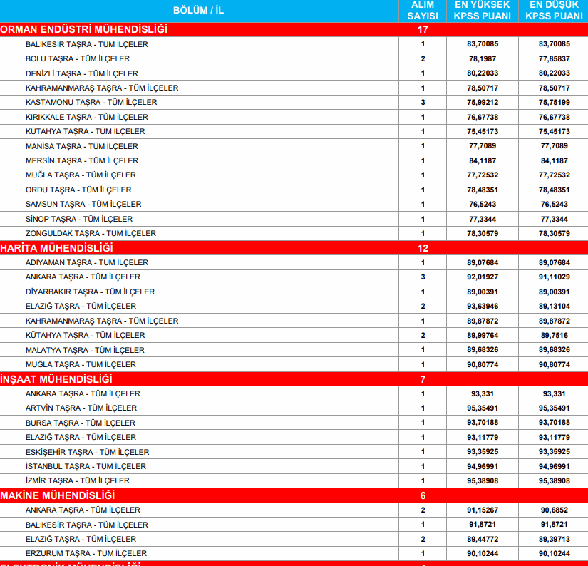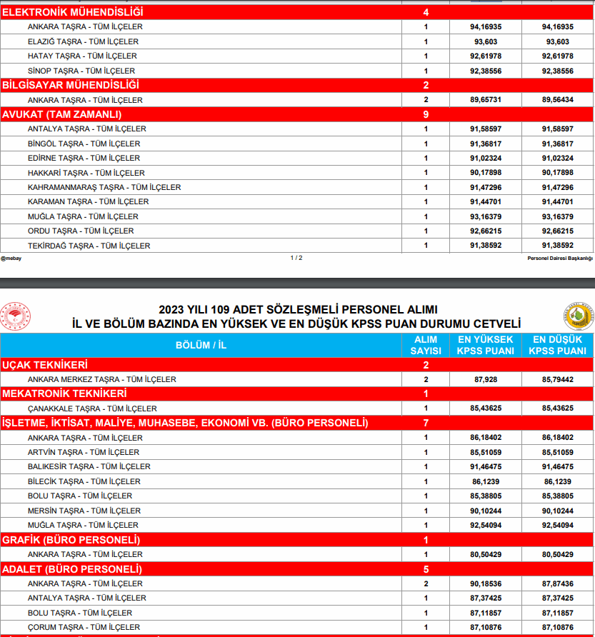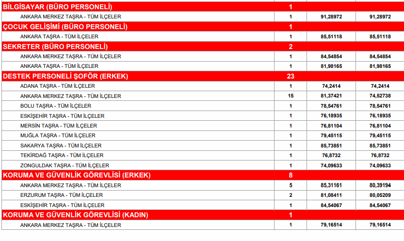 Genel Müdürlüğümüz merkez ve taşra birimlerinde 657 Sayılı Devlet Memurları Kanunu'nun 4. Maddesinin (B) fıkrasına göre istihdam edilmek üzere 06.06.1978 tarihli ve 7/15754 sayılı Kararnameye ekli 28.06.2007 tarihli ve 26566 sayılı Resmi Gazetede yayımlanan Sözleşmeli Personel Çalıştırılmasına İlişkin Esaslarda Değişiklik Yapılmasına Dair Esaslar'da yer alan ek 2'inci maddenin (b) fıkrası gereğince 'Yazılı ve/veya sözlü sınav yapılmaksızın, KPSS (B) grubu puan sıralaması esas alınmak suretiyle" 05/01/2023 - 13/01/2023 tarihleri arasında başvuruları alınan 109 (yüz dokuz) adet Sözleşmeli Personel alımına ilişkin sonuçlar 2022 yılı Ortaöğretim KPSSP94, Önlisans KPSSP93, Lisans KPSSP3 puan sırası esas alınmak suretiyle başvuruda bulunan adayların tercihleri ve puanları doğrultusunda elde edilmiş olup, Cumhurbaşkanlığı Kariyer Kapısı Kamu İşe Alım sistemi tarafından yerleştirme işlemi yapılmış ve adaylar sonuçlarını https://isealimkariyerkapisi.cbiko.gov.tr adresindeki sistemden e-devlet şifreleri ile öğrenebilecektir.