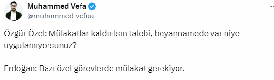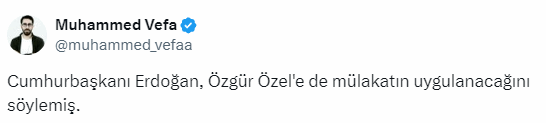 Vefa yaptığı son dakika açıklamasında, "Cumhurbaşkanı Erdoğan, Özgür Özel'e de mülakatın uygulanacağını söylemiş" ifadelerini kullandı.