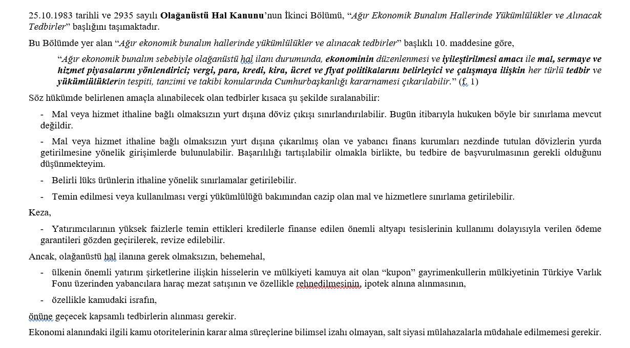 "Türk Lirasının yabancı paralar karşısındaki süregelen değer kaybı, 'AĞIR EKONOMİK BUNALIM' sonucunun ortaya çıkacağı süreci başlatmıştır. Bu nedenle kaçınılmaz görünen ağır ekonomik bunalım sebebiyle OLAĞANÜSTÜ HAL ilanına (Any., m. 119), toplum olarak hazırlıklı olmamız gerekir."