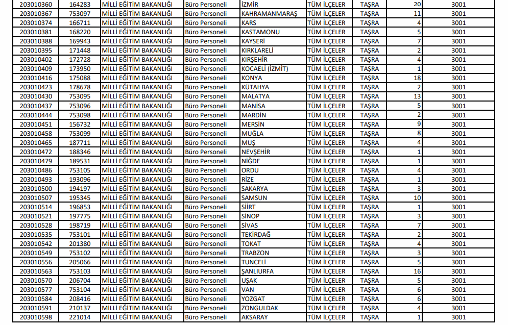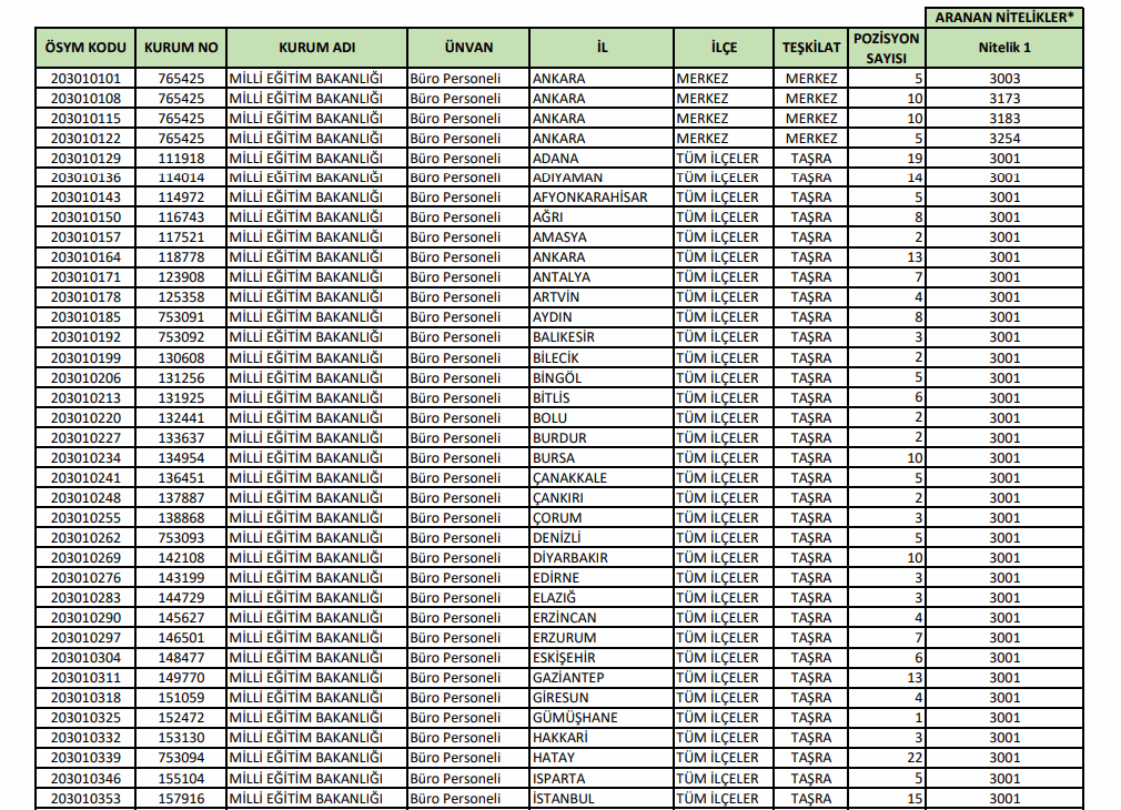 Kılavuzda büro personeli alımı yapılacak yerler şu şekilde paylaşıldı: