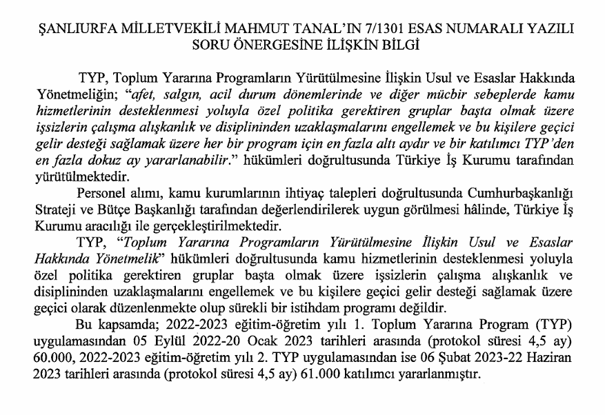 "ŞANLIURFA MİLLETVEKİLİ MAHMUT TANAL'IN 7/1301 ESAS NUMARALI YAZILI SORU ÖNERGESİNE İLİŞKİN BİLGİ