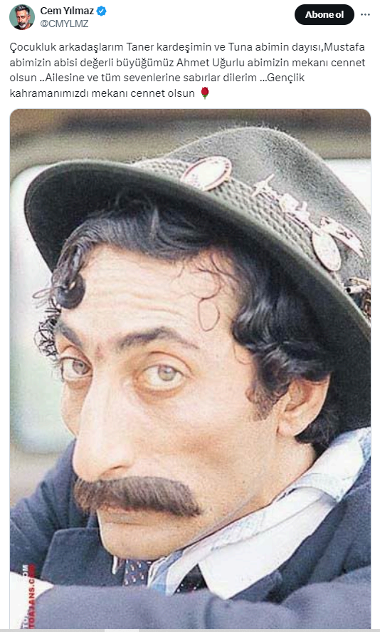 Algöz paylaşımında "Büyük sanatçı, değerli ağabeyimiz Ahmet Uğurlu'yu kaybettik. Çocukluğumuzun ve gençliğimizin, Çobanbey mahallemizin ilk aktörü.. Hepimizin ilham kaynağı…Allah rahmet eylesin. Hepimizin başı sağ olsun.. Çok büyük kayıp." ifadelerine yer verdi.