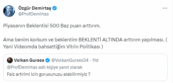 Bir sosyal medya kullanıcısının faiz artırımı konusunda görüşlerini sorduğu Özgür Demirtaş, piyasaların 500 baz puanlık faiz artırımı beklediğini söyleyerek şu ifadeleri kullandı: