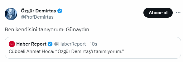 Geçen hafta yaptığı Günaydın ile ilgili gündem olan sözler söyleyen Cübbeli Ahmet, "Ben Selam Verilmeyecek Adama Günaydın Derim" dedi. Bu açıklamasına Özgür Demirtaş'ın cevabı gündem olurken Cübbeli, yaptığı yeni açıklamada, "Özgür Demirtaş'ı tanımıyorum" dedi.