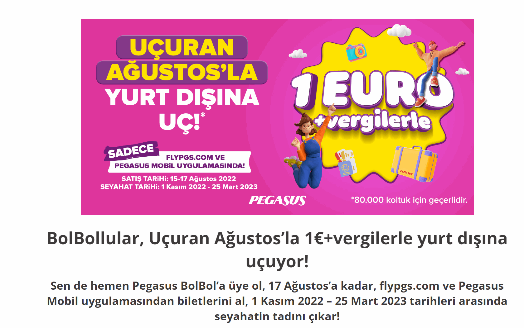 Emlakkulisi'nin haberine göre; Pegasus Havayolları'ndan, kampanya dahilindeki biletler, Pegasus Mobil Uygulaması'ndan alınmakta. 1 Euro kampanyasından bilet alan vatandaşlar, almış oldukları biletleri 1 Kasım 2022 – 25 Mart 2023 tarihleri arasında kullanabilecektir. Ücret duyurusu, ilgili ücret sınıfından sunulmakta olan koltuk adedi sayı ile sınırlı olmakla birlikte 80 bin olarak belirlenmiştir.