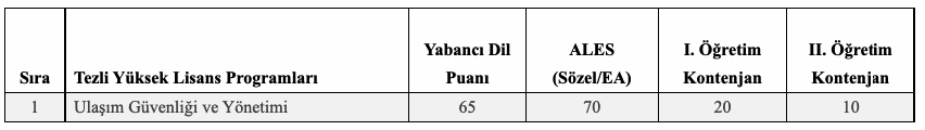 TRAFİK ENSTİTÜSÜ LİSANSÜSTÜ EĞİTİM PROGRAMINA ÖĞRENCİ ALIMI KONTENJANLARI: