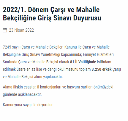 7245 sayılı Çarşı ve Mahalle Bekçileri Kanunu ile Çarşı ve Mahalle Bekçiliğine Giriş Sınavı Yönetmeliği kapsamında; Emniyet Hizmetleri Sınıfında Çarşı ve Mahalle Bekçisi olarak 81 İl Valiliğinde istihdam edilmek üzere en az lise ve dengi okul mezunu toplam 3.250 erkek Çarşı ve Mahalle Bekçisi alımı yapılacaktır.