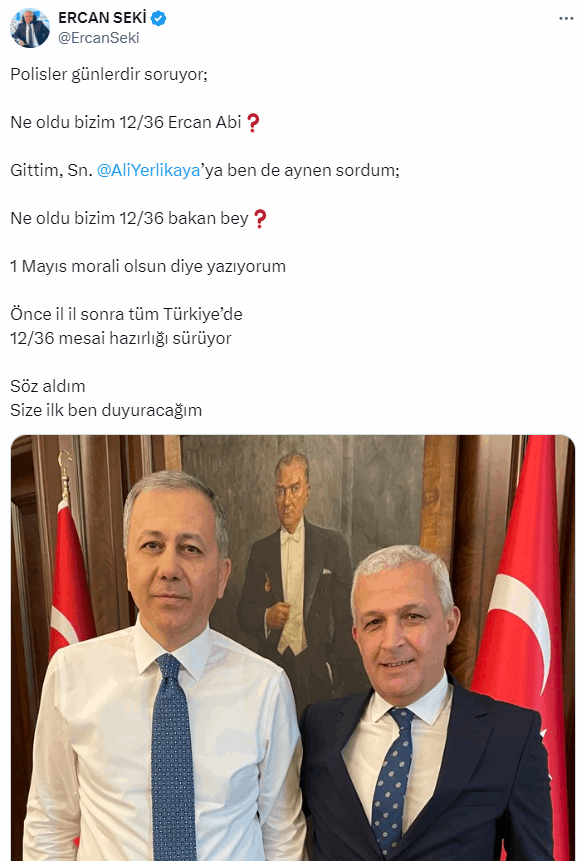 Seki'nin paylaşımına göre Ali Yerlikaya, ilk olarak il il, daha sonra tüm Türkiye'de 12-36 mesai saatlerine geçileceğini, söz aldığını söyledi.