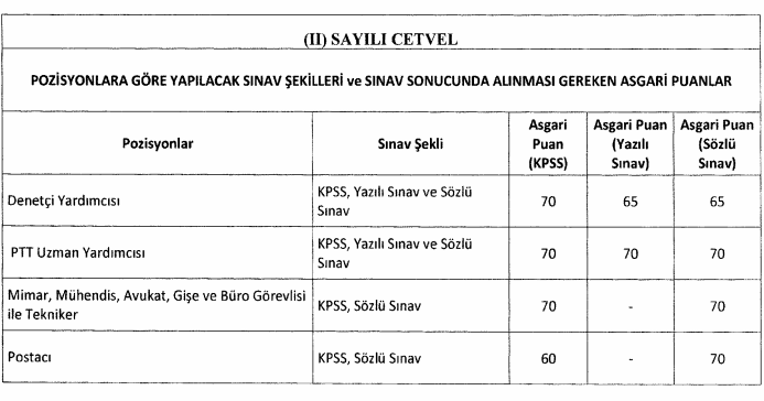 Tabloya baktığımızda denetçi yardımcısı kadrosu için, uzman yardımcısı kadrosu için ve mimar, mühendis, avukat ile gişe görevlisi ve tekniker kadroları için 70 KPSS puanı istenecek. Sadece postacı kadrosu için KPSS puan şartı 60 olacak.