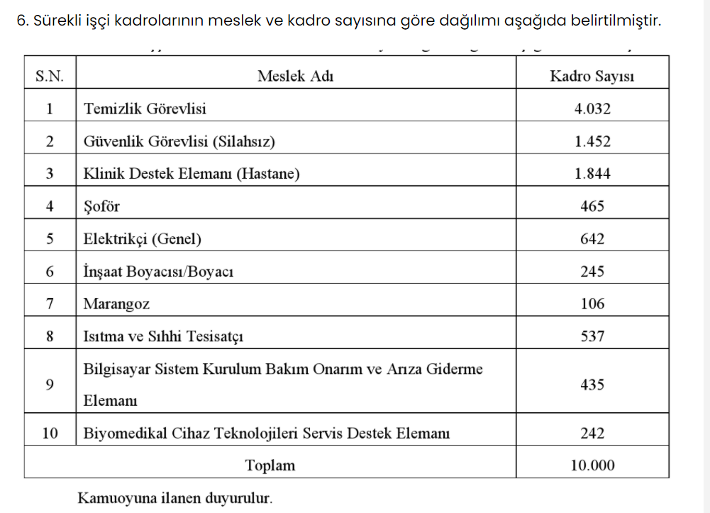 10 BİN İŞÇİ ALIMINDA KADRO DAĞILIMI