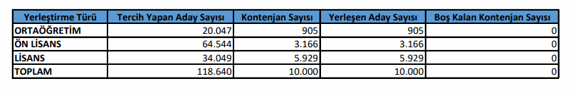 ÖSYM'nin sonuç sayfasında yayımladığı sayısal verilere baktığımızda 10 bin sözleşmeli personel kadrosunun tamamına yerleştirmelerin yapıldığı görüldü. Sayısal verilere göz attığımızda ortaöğretim mezunları için açılan 905 kadroya 20 bin 47 kişinin başvuru yaptığı öğrenildi. Ön lisans için açılan 3 bin 166 kadroya ise 64 bin 544 kişinin başvuru yaptığı görüldü. Lisans mezunları için 5 bin 929 kadro açıldığı ve bu kadrolara 34 bin 49 kişinin başvuru yaptığı görüldü.
