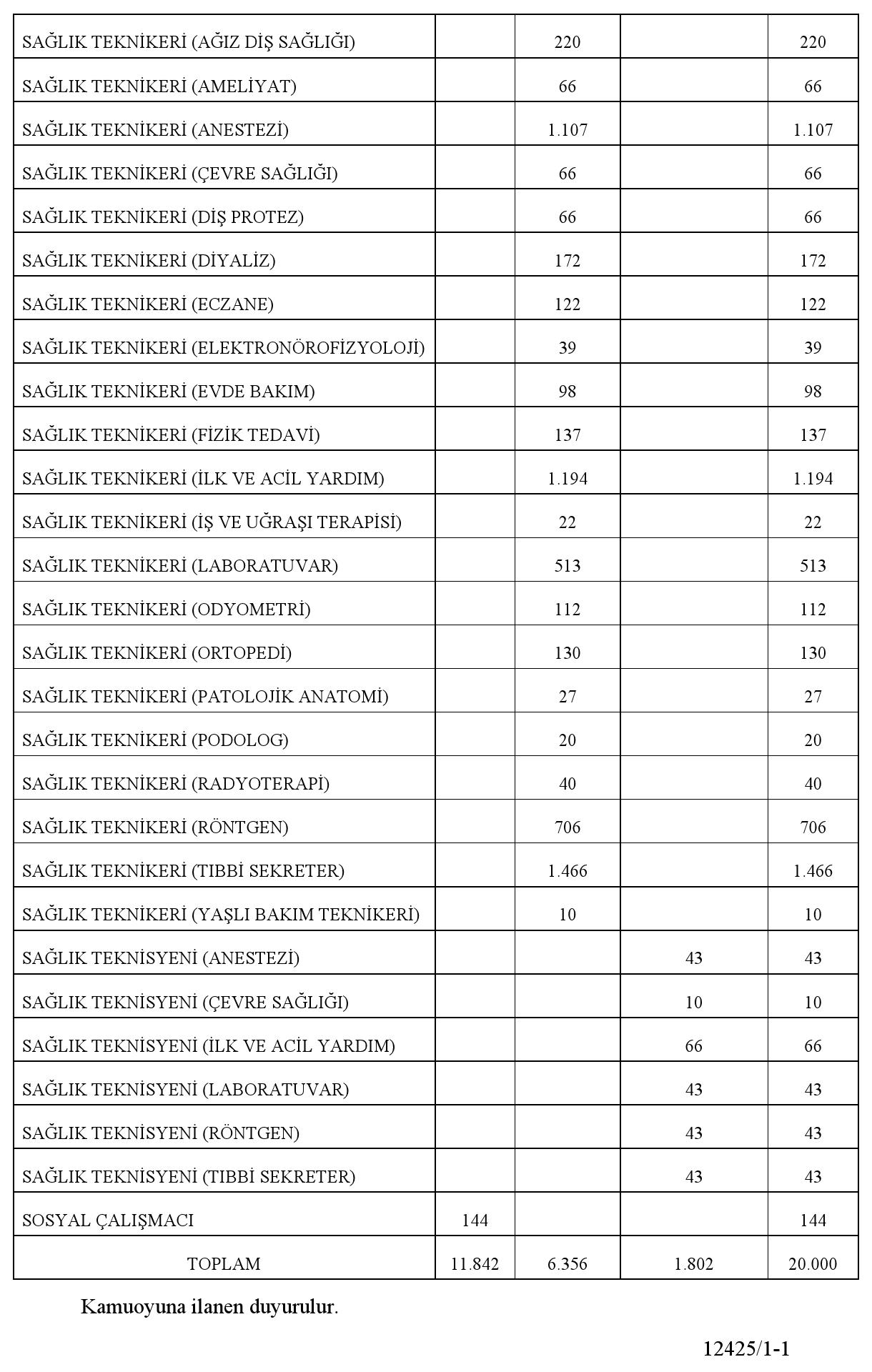 Sağlık Bakanlığınca atanacak 20 bin sözleşmeli sağlık personeli ile ilgili ilan Resmi Gazete'de yayımlandı. Buna göre, Sağlık Bakanlığının taşra teşkilatı hizmet birimlerinde istihdam edilmek üzere Kamu Personel Seçme Sınavı (KPSS) sonucuna göre Ölçme, Seçme ve Yerleştirme Merkezi (ÖSYM) tarafından yapılacak merkezi yerleştirme ile 20 bin sözleşmeli sağlık personeli alınacak.