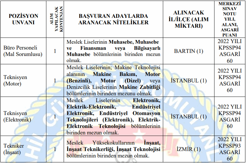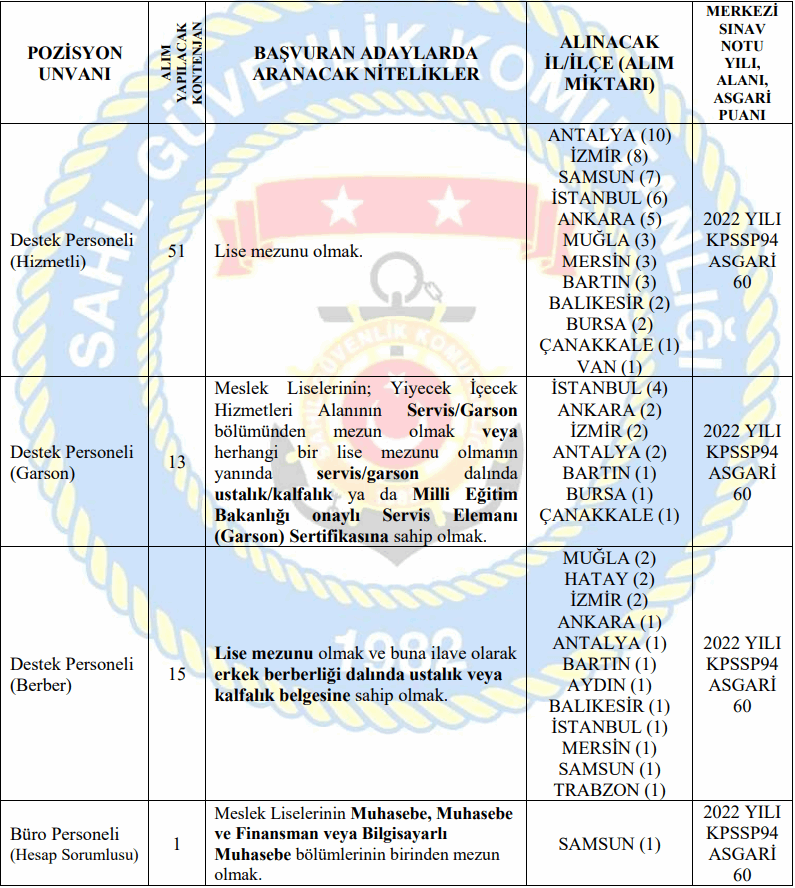 Sahil Güvenlik personel alımı kadroları ve başvuru özel şartları ise şu şekilde: