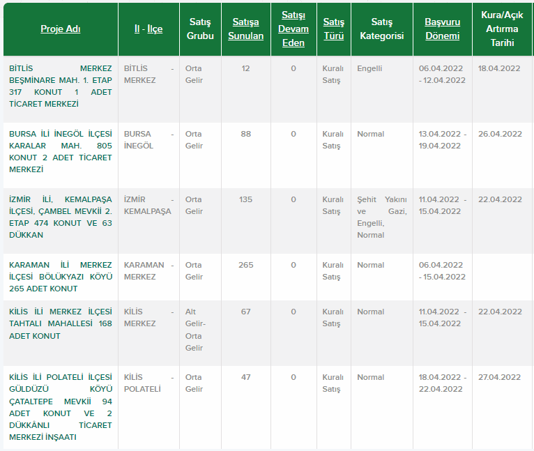 İzmir: "İdaremizce İzmir ili, Kemalpaşa ilçesi, Çambel Mevki’nde inşa ettirilmekte olan 2+1 konut tipi 221 adet ve 3+1 konut tipi 66 adet konut; olmak üzere toplam 287 adet konut 11-15 Nisan 2022 tarihleri arasında başvuru toplanarak kura yöntemi ile satışa sunulacaktır"