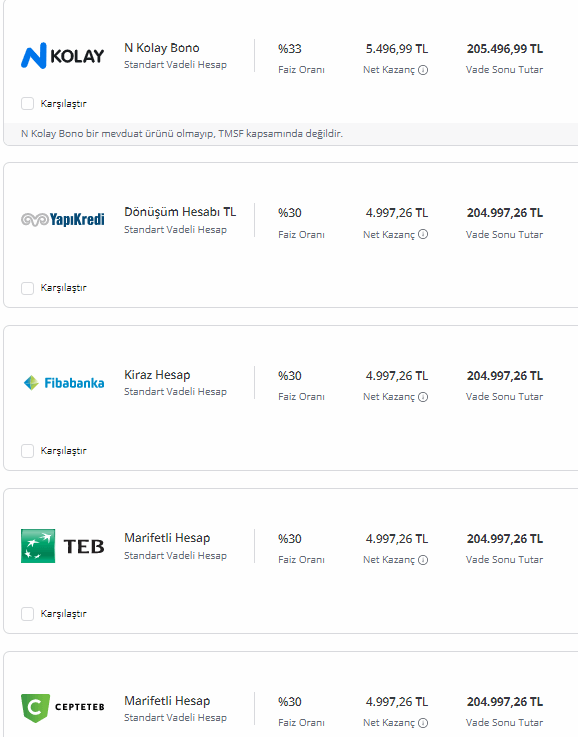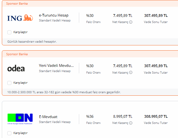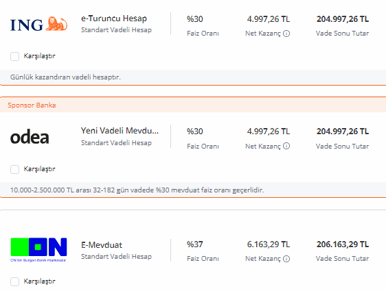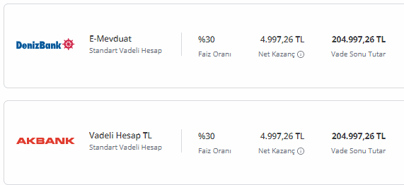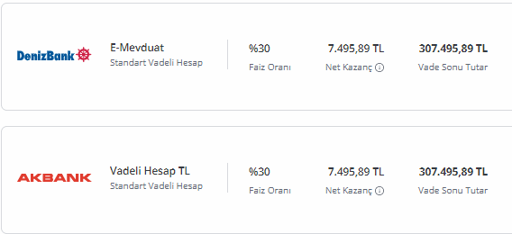 Bankalaırn mevduat hesapları için sunduğu faiz oranları ise şu şekilde: