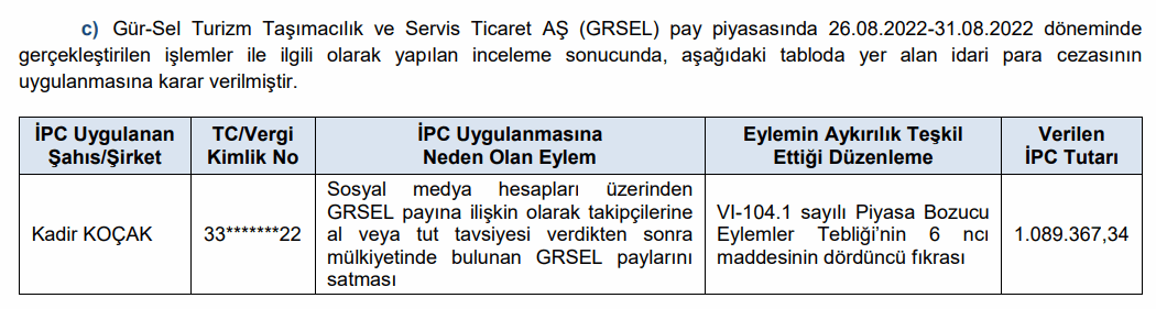 SPK'dan yapılan açıklamada sosyal medya üzerinden hisse al sat tavsiyeleri veren bu bu yolla hisse alımı satımı yapan kişilere başlattığı incelemede Kadir Koçak isimli kişiye 1 milyon lira ceza kestiğini bildirdi. Yapılan açıklamada Koçak, 'Sosyal medya hesapları üzerinden GRSEL payına ilişkin olarak takipçilerine al veya tut tavsiyesi verdikten sonra mülkiyetinde bulunan GRSEL paylarını satması. VI-104.1 sayılı Piyasa Bozucu Eylemler Tebliği'nin 6 ncı maddesinin dördüncü fıkrası. Verilen idari para cezası 1.089.367,34 TL" ifadelerini kullandı.