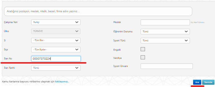 İlan no yazan kısma yukarıda verilen ilan numaralarını yazın daha sonra ara kısmına basın ilan aşağıda sıralanakcaktır.