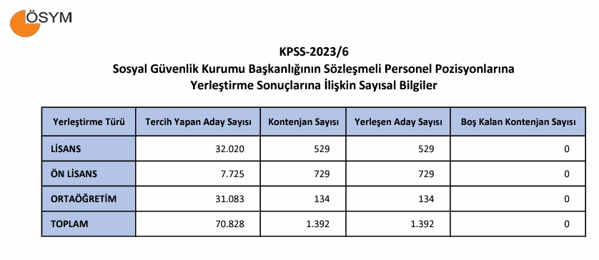 5-11 Ekim 2023 tarihleri arasında tercihleri alınan KPSS-2023/6 Sosyal Güvenlik Kurumu Başkanlığının sözleşmeli personel pozisyonlarına yerleştirme işlemleri tamamlanmıştır.