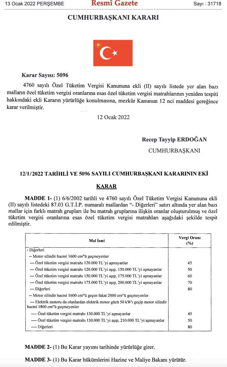 Cumhurbaşkanı Recep Tayyip Erdoğan imzasıyla yayımlanan karara göre, Motor 1600 santimetre küp (cm3) geçmeyenler için yüzde 45, 50, 80 şeklinde üç farklı dilimde uygulanan ÖTV oranlarına ara kademeler eklendi.