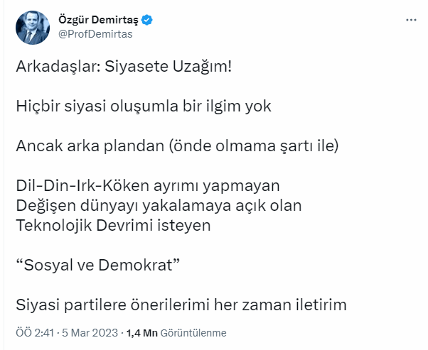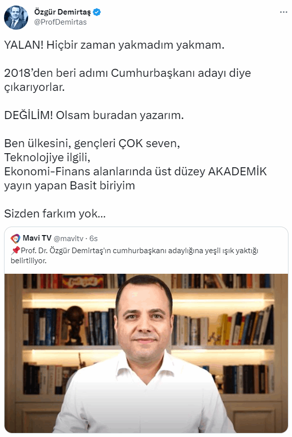 Sabancı Üniversitesi Finans Kürsü Başkanı Prof. Dr. Özgür Demirtaş'ın da Cumhuraşkanı adayı olmayı istediği iddiaları sosyal medya üzerinde dolaştı. İddialarda, 'Prof. Dr. Özgür Demirtaş'ın cumhurbaşkanı adaylığına yeşil ışık yaktığı belirtiliyor" denildi. Bu açıklama sosyal medya üzerinde kısa sürede gündem olmuş ve binlerce paylaşım gelmişti.