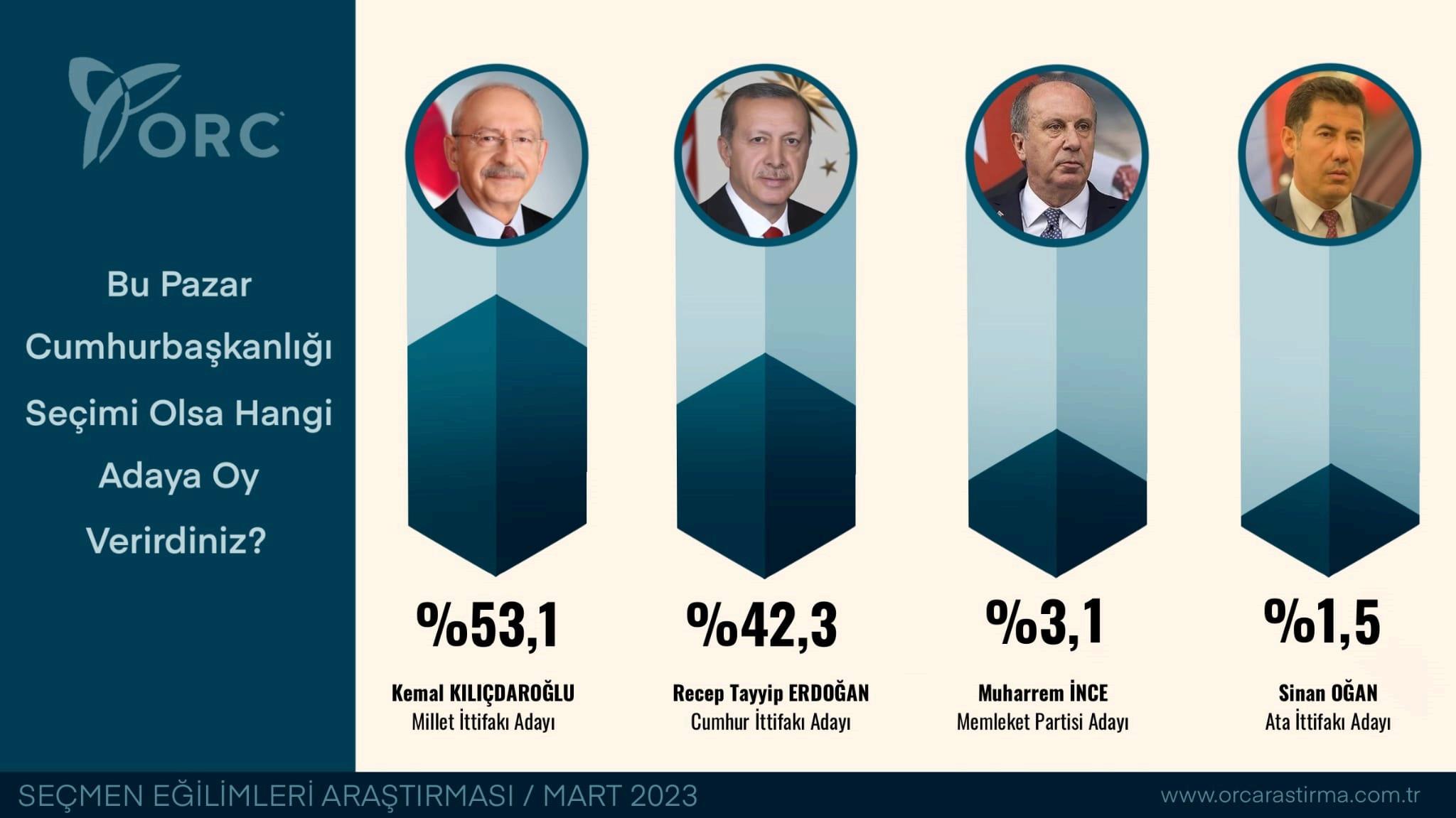 ORC Araştırma tarafındna bir son dakika açıklaması yapuıldı. Yapılan açıklamada son seçim anketinin sonuçlarına yer verildi. Adayların açıklanmasından sonra yapılan seçim anketinin sonucuna baktığımızda Kılıçdaroğlu'nun Cumhurbaşkanlığında büyük fark açtığı görülüyor.