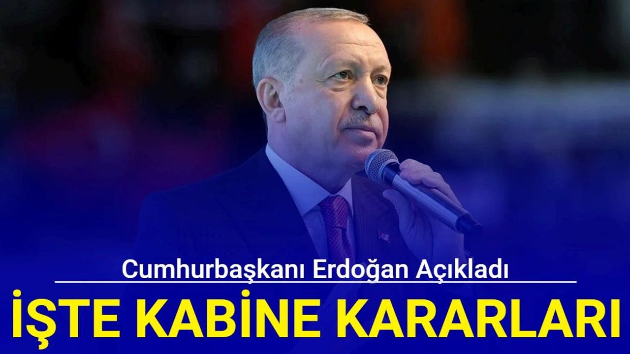 Kabine toplantısı sona erdi. Beştepe'de bulunan Cumhurbaşkanlığı Külliyesi'nde, Cumhurbaşkanı ve AK Parti Genel Başkanı Recep Tayyip Erdoğan'ın başkanlığında toplanan kabine , önemli kararlara imza attı. Cumhurbaşkanı Erdoğan'ın başkanlığındaki kabine toplantısının sona ermesinden sonra kameralar karşısına geçti kabine kararlarını da kamuoyuna açıklamaya başladı.