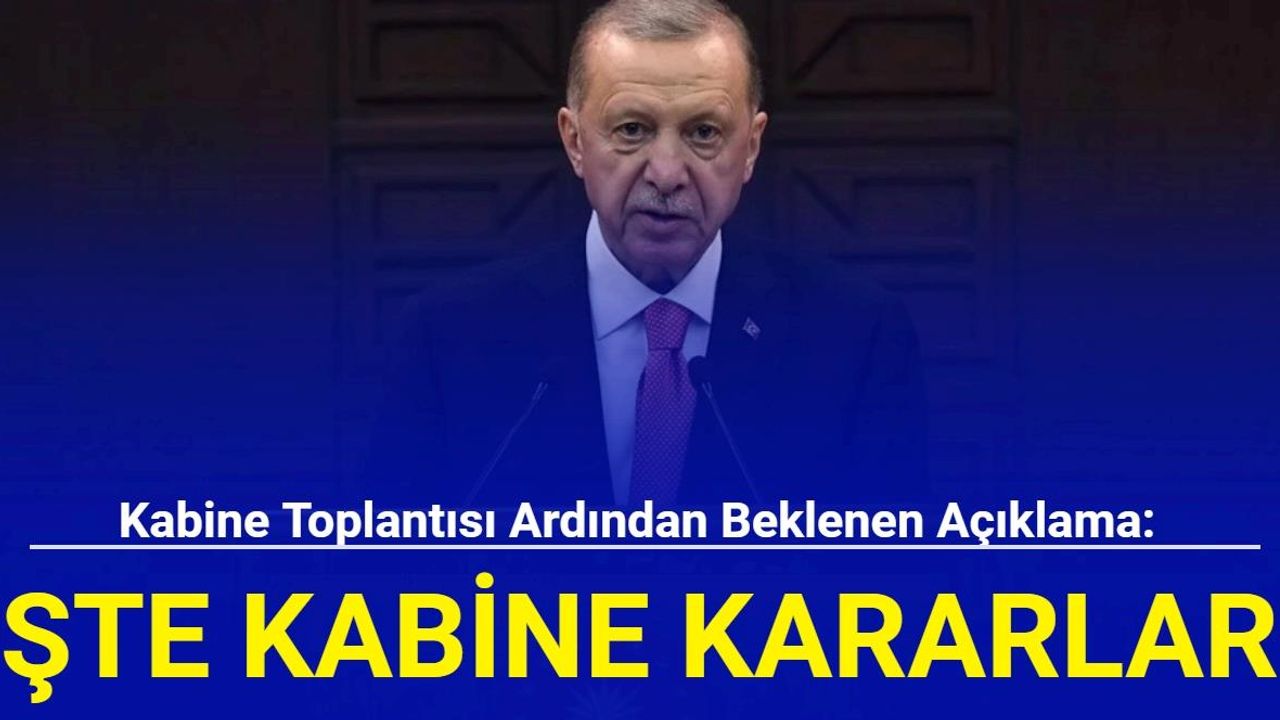 Kabine toplantısı sona erdi. Beştepe'de bulunan Cumhurbaşkanlığı Külliyesi'nde, Cumhurbaşkanı ve AK Parti Genel Başkanı Recep Tayyip Erdoğan'ın başkanlığında toplanan kabine , önemli kararlara imza attı. Cumhurbaşkanı Erdoğan'ın başkanlığındaki kabine toplantısının sona ermesinden sonra kameralar karşısına geçti kabine kararlarını da kamuoyuna açıklamaya başladı.
