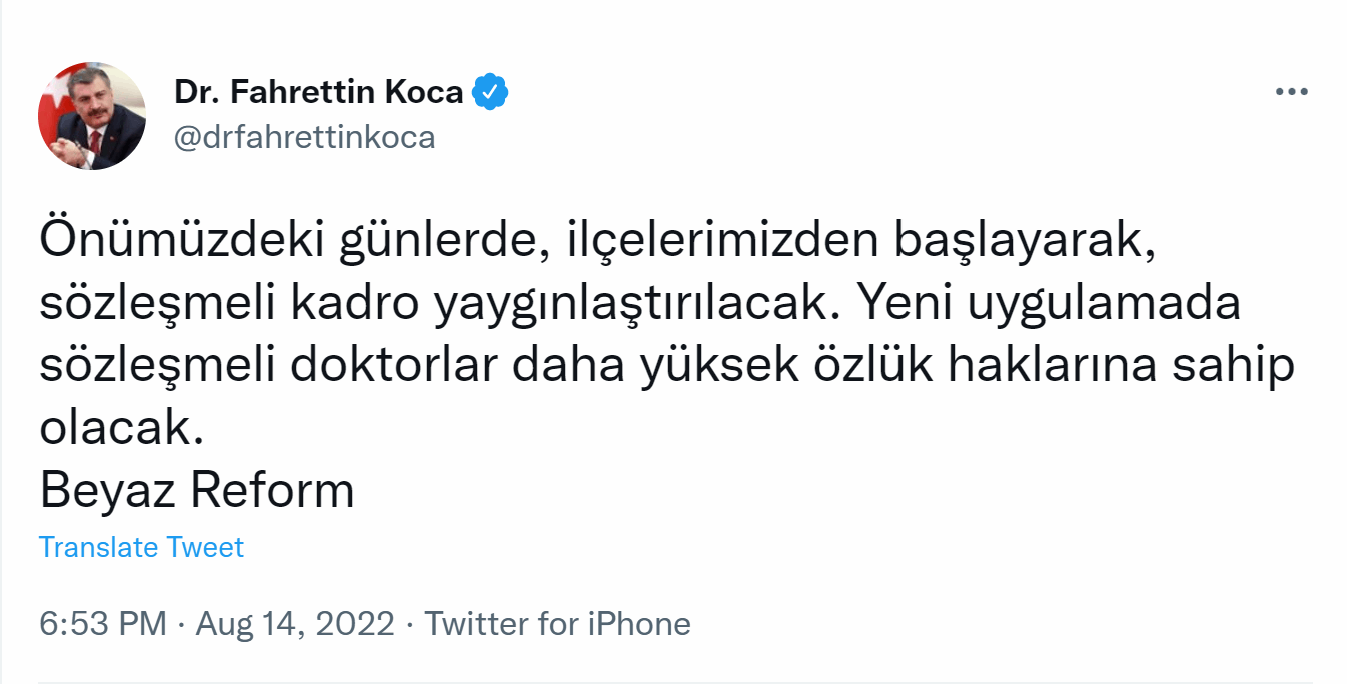 'Önümüzdeki günlerde, ilçelerimizden başlayarak, sözleşmeli kadro yaygınlaştırılacak. Yeni uygulamada sözleşmeli doktorlar daha yüksek özlük haklarına sahip olacak.'