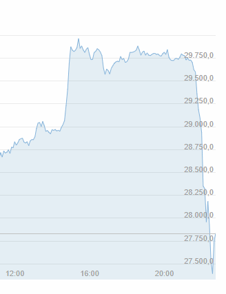 Kripto para piyasasında bugün gündüz saatlerinde sert yükseliş görülürken az önce sert şekilde bir düşüş görüldü. Gündüz saatlerinde 29 bin 950 dolara kadar çıkan Bitcoin fiyatı, az önce ani bir şekilde düşerek 2 bin 500 dolardan fazla değer kaybetti ve 27 bin 389 dolara kadar geriledi. İşte BTC fiyatında yaşanan düşüşün grafiği: