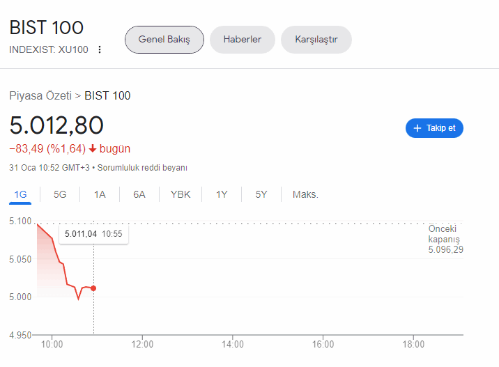 Borsada son günlerde düşüş eğilimi devam ediyor. Gelen sond akika bilgilerine göre Borsada bugün de eksi ile güne başlangıç oldu. Gelen haberlere göre Bist 100 endeksi yüzde 1.64'lük kayıpla 5012 seviyesine kadar geldi. Peki borsada neden düşüş oldu? Borsa neden düşüyor? Yükselecek mi?